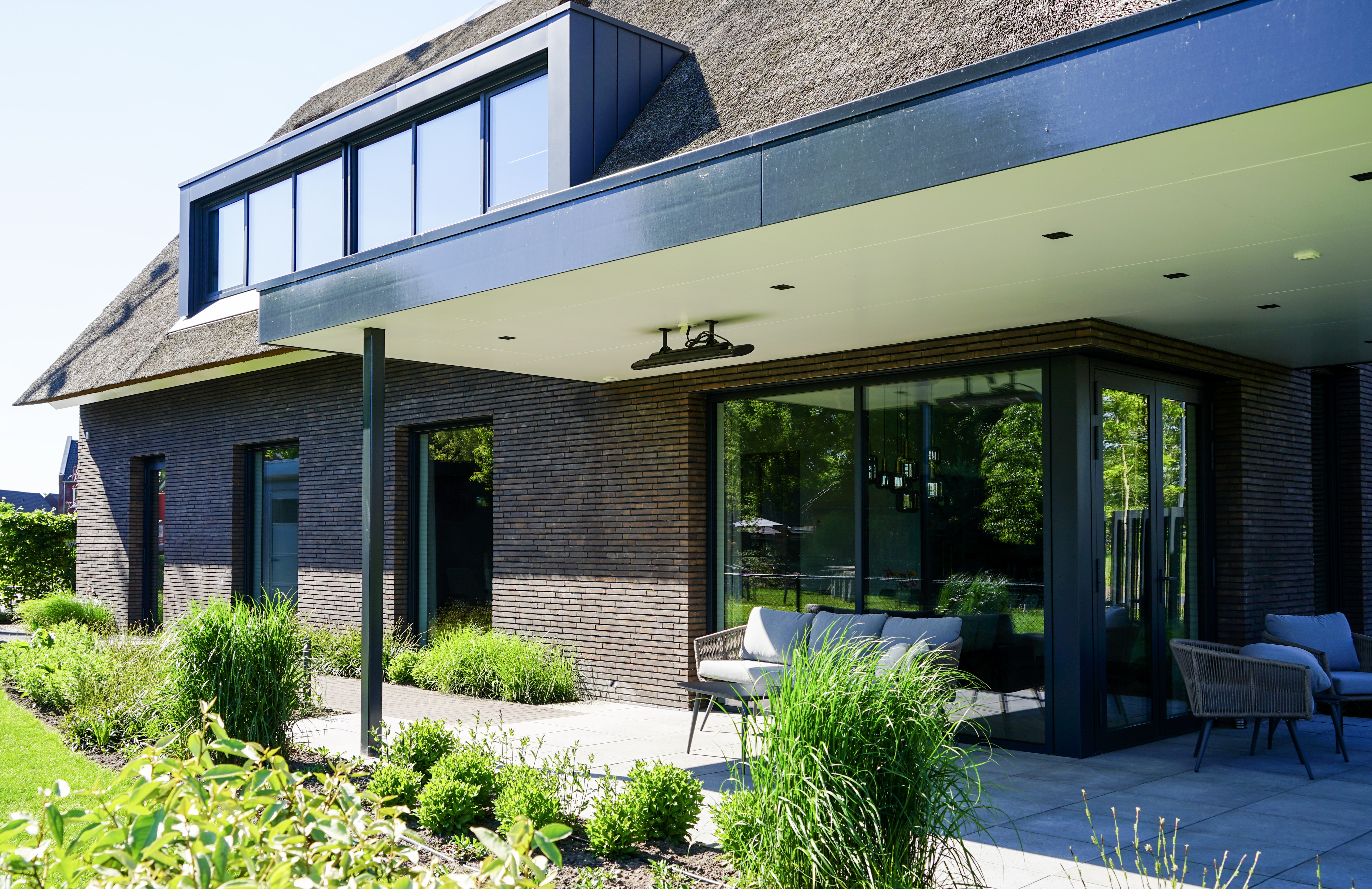 Deze prachtige landelijk, moderne woning ligt aan de rand van een nieuwbouwwijk in Best. De rieten kap, donkere steen en risaliet leveren een mooi plaatje op. We plaatsten hier vleugeloverdekkende dubbele garagedeuren én een vleugeloverdekkende voordeur met een vleugelhoge greep. Daarnaast leverden en plaatsten we de aluminium waterslagen en het zetwerk bij de dakkapellen en risaliet.